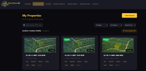 Log into your ParcelView 3D account. From the main dashboard, click the Properties tab in the top navigation bar. This opens your property library — a grid of all listings organized by county, showing the parcel thumbnail, APN, acreage, location, and quick-action links for each property.